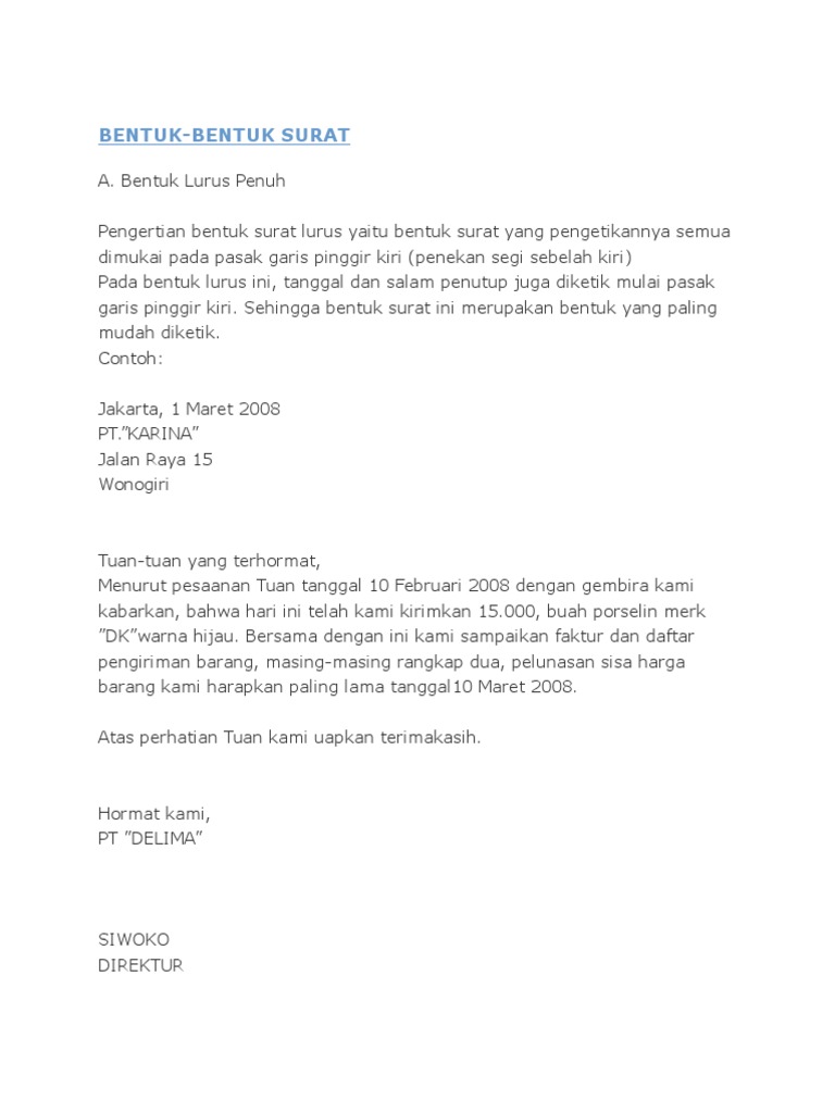 Kiriman saudara berupa 10 meja kantor dalam 5 kotak besar dengan menggunakan truk makmur jaya telah kami terima dengan senang hati. Contoh surat bentuk semi block. Untuk mengunduh file gunakan tombol download yang tersedia kemudian buka link download yang muncul. Walaupun dalam bentuk bahasa inggris susunan surat semi block style ini masih runtut diawali dari kop surat 6 contoh surat pengiriman pembayaran standar perusahaan 2019. Berikut ini adalah contoh surat bentuk setengah lurus semi block style baca juga. Berikut ini contoh surat penawaran dalam bentuk semi block style surat pengiriman barang biasanya dibuat sebagai balasan dari surat pesanan barang yang dilakukan sebuah perusahaan. Saat anda menerima pesanan dari konsumen, maka sudah seharunya bagi anda untuk menanggapi surat pesanan tersebut secepat mungkin. Selain contoh surat diatas, anda bisa juga melihat beberapa contoh surat lain yang sudah kami siapkan untuk anda, supaya ada bahan perbandingan, dengan begitu anda bisa memilih contoh surat yang paling sesuai dengan keinginan anda. Sedikit berbeda dengan yang pertama, untuk penulisan surat jenis ini terdapat bagian alamat tujuan ada dalam contoh surat pesanan barang yang baik dan benar. Surat semi block style penawaran barang surat penawaran barang adalah surat yang dibuat untuk kepentingan bisnis atau perniagaan. Dalam hal ini anda pun bisa menggunakan surat surat pesanan merupakan surat yang dipergunakan untuk memesan barang atau jasa dari supplier. Anda harus memesan barang atau produk. Contoh surat pengiriman barang block style baik yang semi maupun full block ini memang tidak asing dan digunakan pada penulisan berbagai macam surat sedangkan untuk surat pengiriman dalam bentuk fisik akan dikirim khusus secara terpisah atau menjadi satu dengan barang yang dikirim.